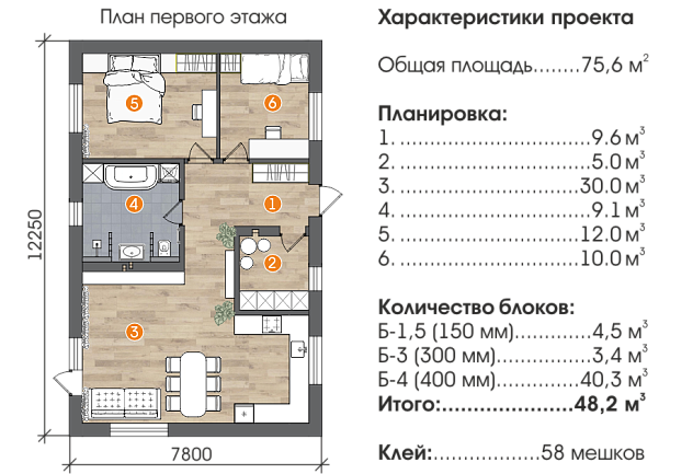 Уютный одноэтажный дом площадью в семьдесят шесть квадратных метров. Просторная кухня-гостиная с панорамными окнами подойдет радушным хозяевам, имеется возможность пристроить отличную террасу, устроив в одном из окон гостиной балконную дверь. Ванная комната позволит разместить не только душевую кабинку, но и джакузи. Большая спальная комната при необходимости может быть поделена на две отдельных спальни.